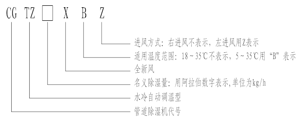 1. CGTZ60X:表示名義除濕量為60kg/h,進(jìn)風(fēng)方式為右進(jìn)風(fēng),適用溫度范圍為18℃~35℃的全新風(fēng)水冷自動(dòng)調(diào)溫型管道除濕機(jī)